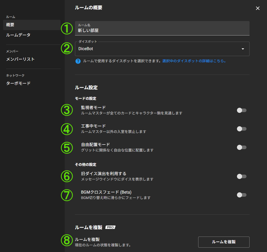 <table><thead><tr><th width="250">項目</th><th>概要</th></tr></thead><tbody><tr><td>①ルーム名</td><td>ルーム名を確認・変更できる</td></tr><tr><td>②ダイスボット</td><td>ダイスボットを選択する</td></tr><tr><td>③監視者モード</td><td>ルームマスターが全ての伏せられている情報を見通せる</td></tr><tr><td>④工事中モード</td><td>ルームマスター以外がルームに入室できないようにする</td></tr><tr><td>⑤自由配置モード</td><td>グリッドに関係なくパネルなどを配置する</td></tr><tr><td>⑥旧ダイス演出を利用する</td><td>メッセージウインドウの上にダイスを表示する</td></tr><tr><td>⑦BGMクロスフェード (Beta)</td><td>BGMを切り替えるとき滑らかにフェードする</td></tr><tr><td>⑧ルームを複製</td><td>ルームを複製する<br><code>CCFOLIA PROプランでのみ使用できる機能です。</code></td></tr></tbody></table>